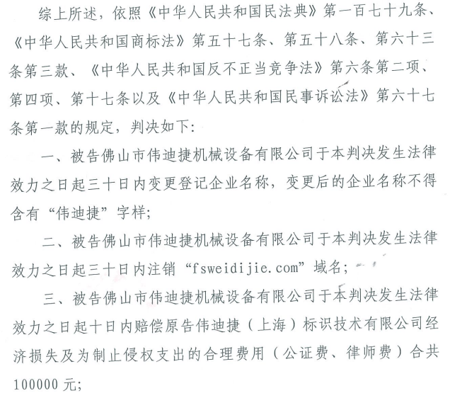 針對(duì)上述侵權(quán)行為,偉迪捷上海噴碼機(jī)公司向廣東省佛山市禪城區(qū)人民法院提起侵害商標(biāo)權(quán)及不正當(dāng)競(jìng)爭(zhēng)訴訟,并于2022年1月7日獲得一審勝訴判決(案號(hào):(2021)粵0604民初23505號(hào)),法院認(rèn)定佛山市偉迪捷機(jī)械設(shè)備有限公司實(shí)施的相關(guān)行為構(gòu)成商標(biāo)侵權(quán)及不正當(dāng)競(jìng)爭(zhēng),要求其變更登記企業(yè)名稱,不得使用含有“偉迪捷”字樣的企業(yè)名稱,注銷域名“fsweidijie.com”,并賠償我公司經(jīng)濟(jì)損失及維權(quán)合理開支共計(jì)100,000元。